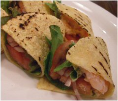 | 半分にカットしたコーン・トルティに焦げ目をつけて、海老・サーモン・野菜などをはさむ |