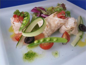 | フランス料理の前菜にトルティを使ってもらいました。 米粉・トルティをカットして、野菜など巻いています。 ちょっとごげめを付けて香ばしさを。 とてもおしゃれになった。 焼きを入れるとかたくなると思っていたけど、中身の具材を上手く合わせることで、しっとり感を出している。 |