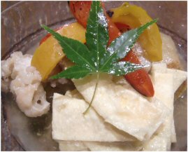 | トルティに海老しんじょうをはさみ揚げるというのはなかなかのアイデアでびっくり。トルティをカットして甘酢に漬けたものは、湯葉のようで食感は全く違う。 和食でも十分通用するのをあらためて教えてもらった。 |