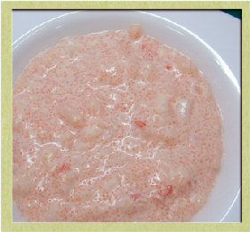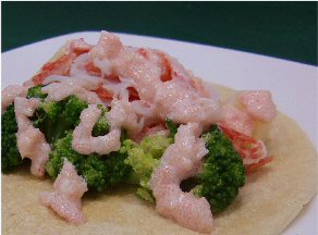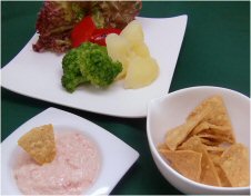 | 作り方: クリームチーズ30gはよく練ってやわらかくし、みじん切りした玉ねぎ100g、オリーブ油 小さじ1、マヨネーズ大さじ1、袋を剥がしたたらこ1腹とかにかまみじん切り20gを加えてよくかき混ぜる。 最後にこしょうを少々振りかけ混ぜる。 |